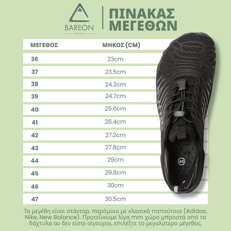 με ταBAREON PROξυπόλητα παπούτσια.επιλέγεις άνεση, υγιή πόδια και μια φυσική εμπειρία βαδίσματος. Αυτά τα μοναδικά παπούτσια σου χαρίζουν την αίσθηση ότι περπατάς ξυπόλητος, ενώ προσφέρουν προστασίαπροσφέροντας προστασία και στήριξη.